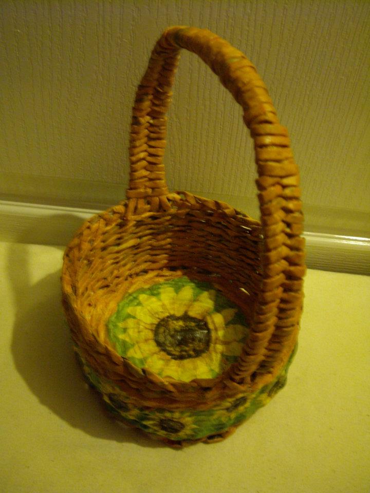 Cosulet impletit din hartie de ziar, decorat cu tehnica servetelului./ Paper wicker basket embellished with the napkin technique.